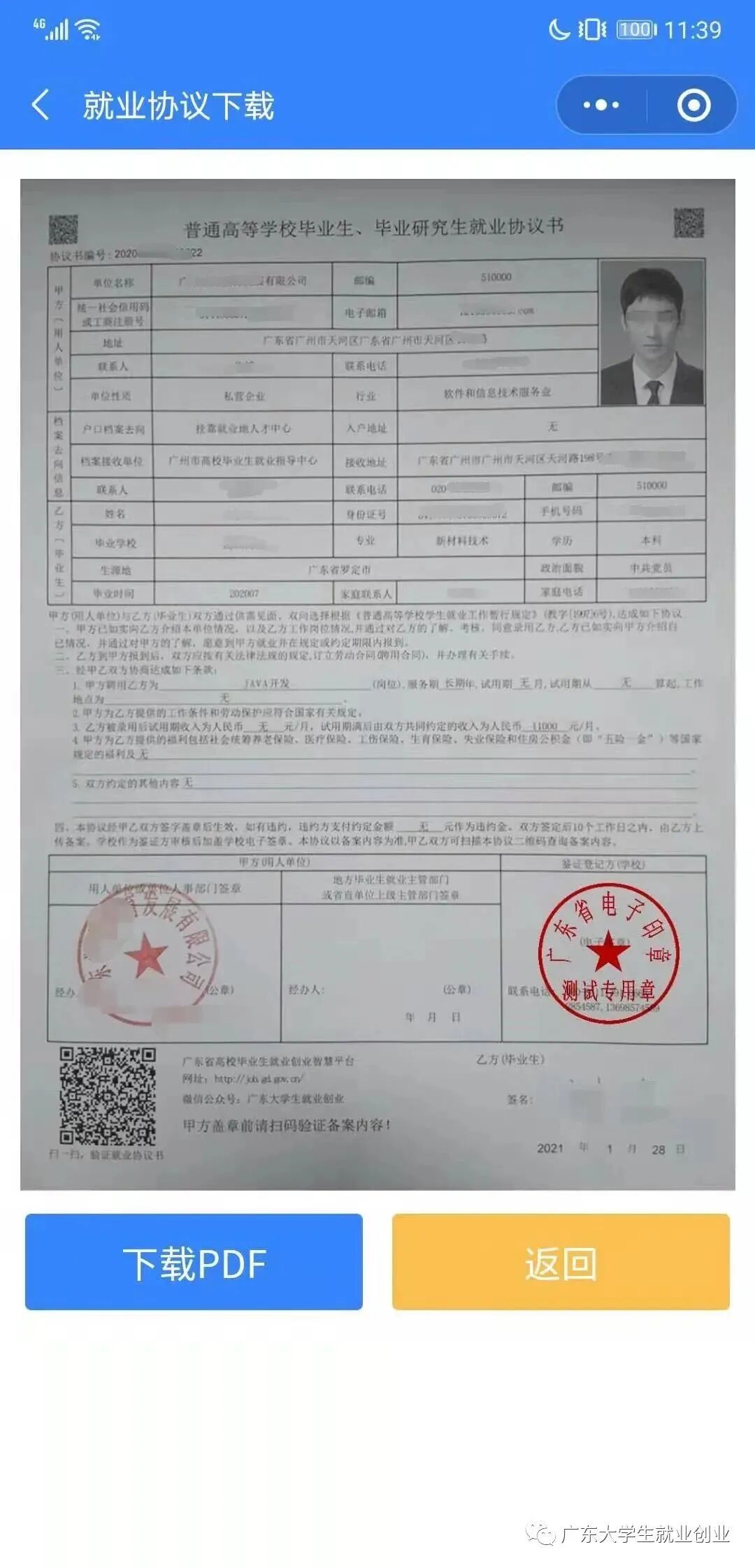 上传签字盖章的纸质就业协议书后,待院校审核完成自动生成带院校电子签章的电子就业协议书,院校和学生都可自行下载打印。