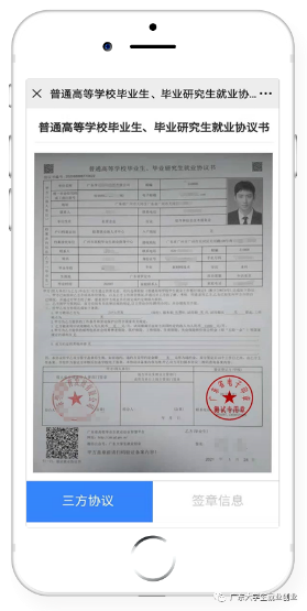 ②审核完成后,学生自行下载电子就业协议书、打印后,拿到用人单位或就业主管部门进行盖章,用手机将已经签字盖章的就业协议书拍照回传到小程序,等待院校进行审核。