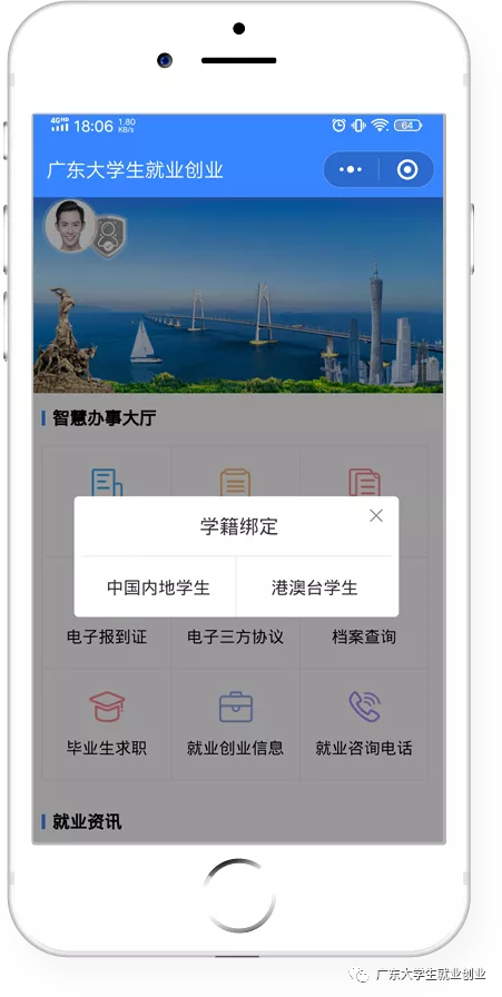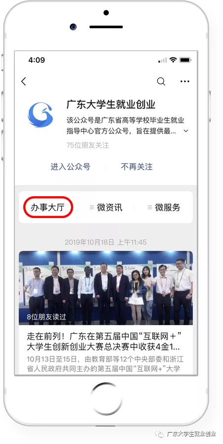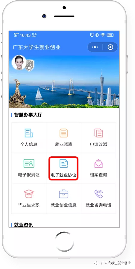 关注“广东大学生就业创业”,点击左下角“办事大厅”。
